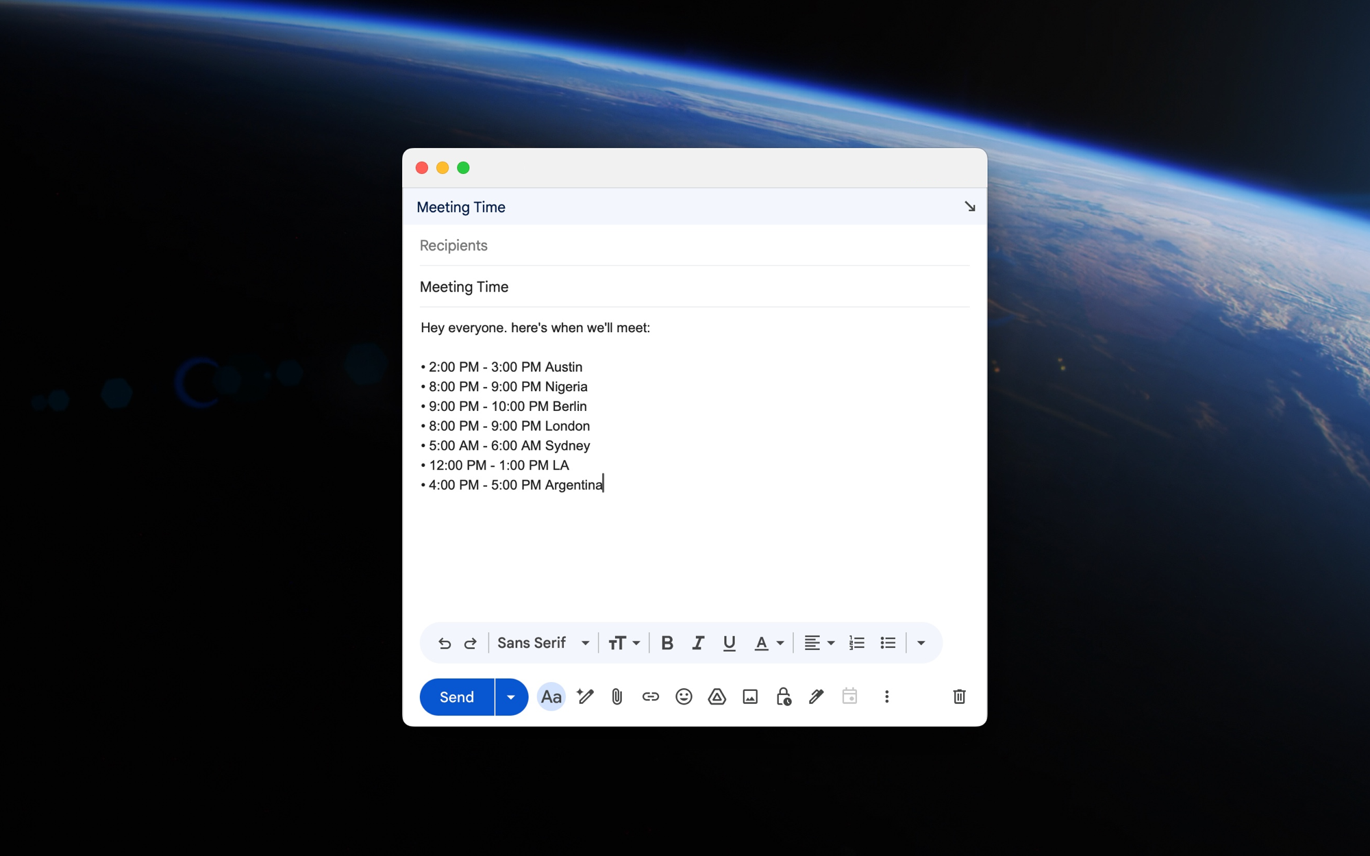 The extension continues to support two output formats (inline and list). For example, you could enter 1pm - 3pm for the time and Austin, London, Sydney for the locations and have it output as either: